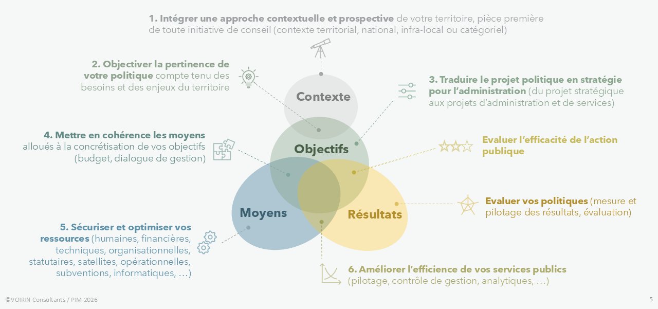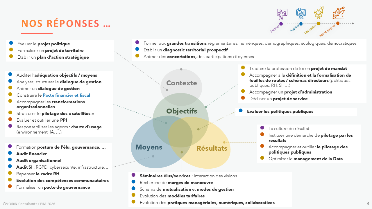 L’alliance entre Public Impact Management et Voirin Consultants associe la séniorité d’intervenants issus du conseil et de la sphère publique, l’ancrage territorial de deux cabinets indépendants, et une expérience reconnue de l’accompagnement des transformations locales. Notre approche repose sur des prestations sur‑mesure, pensées pour produire des impacts tangibles et adaptées aux réalités organisationnelles, financières et politiques des territoires.