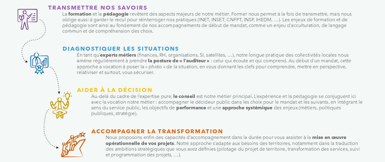 Nous intervenons auprès des élus, des équipes administratives, de l’écosystème territorial et sur la relation à l’usager, en privilégiant un travail collectif, durable et fondé sur la confiance. La complémentarité de nos équipes nous permet de combiner la robustesse méthodologique d’un grand cabinet et l’agilité de deux PME engagées, en mobilisant lorsque nécessaire un réseau éprouvé de partenaires spécialisés (urbanisme, aménagement, sociologie, marketing territorial, communication, juridique…).